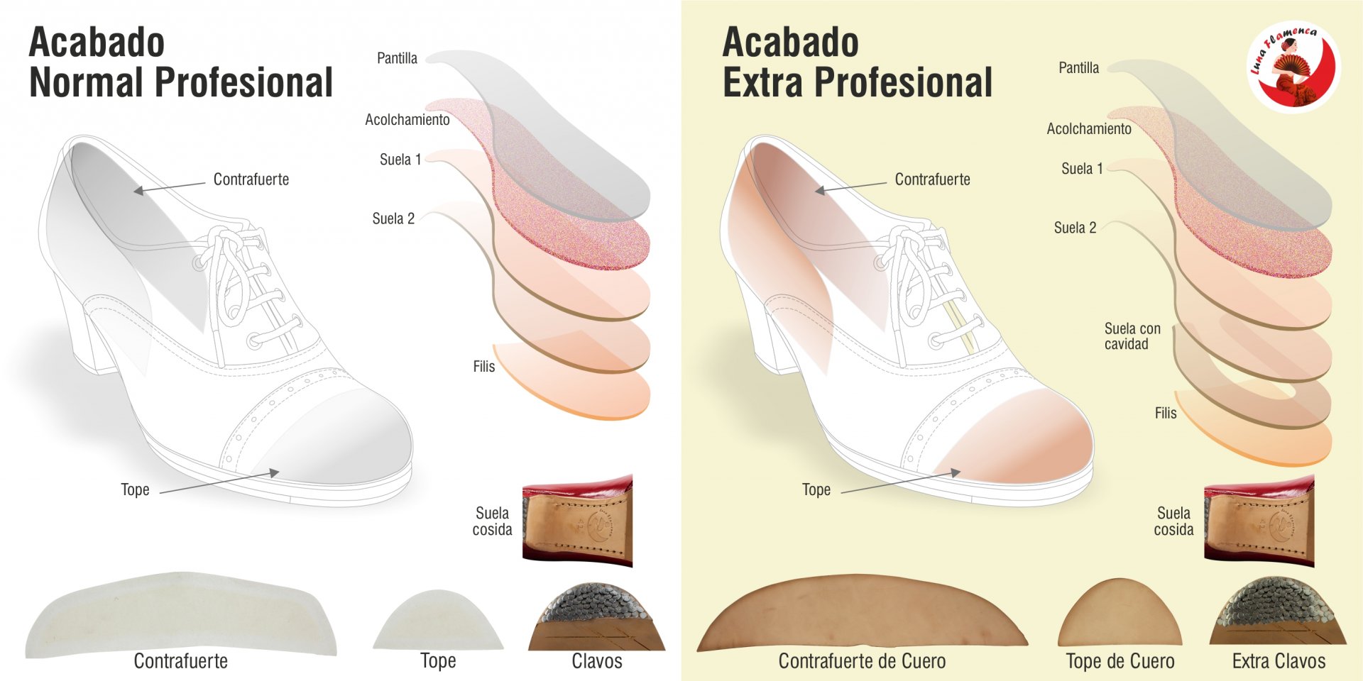 Calzado flamenco de línea clásica abotinado de una pieza, con atadura de cordones. Pieles y forros de 1º calidad. Suela doble de cuero cosida. Doble cantidad de clavos en puntera y tacón puesto uno a uno con pulido final. Refuerzos en puntera y talón. Filis antideslizantes. Fabricado artesanalmente.
