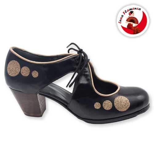 Calzado flamenco de línea nueva con cordones en el empeine. Pieles y forros de 1º calidad. Suela doble de cuero cosida. Doble cantidad de clavos en puntera y tacón puesto uno a uno con pulido final. Refuerzos en puntera y talón. Filis antideslizantes. Fabricado artesanalmente.